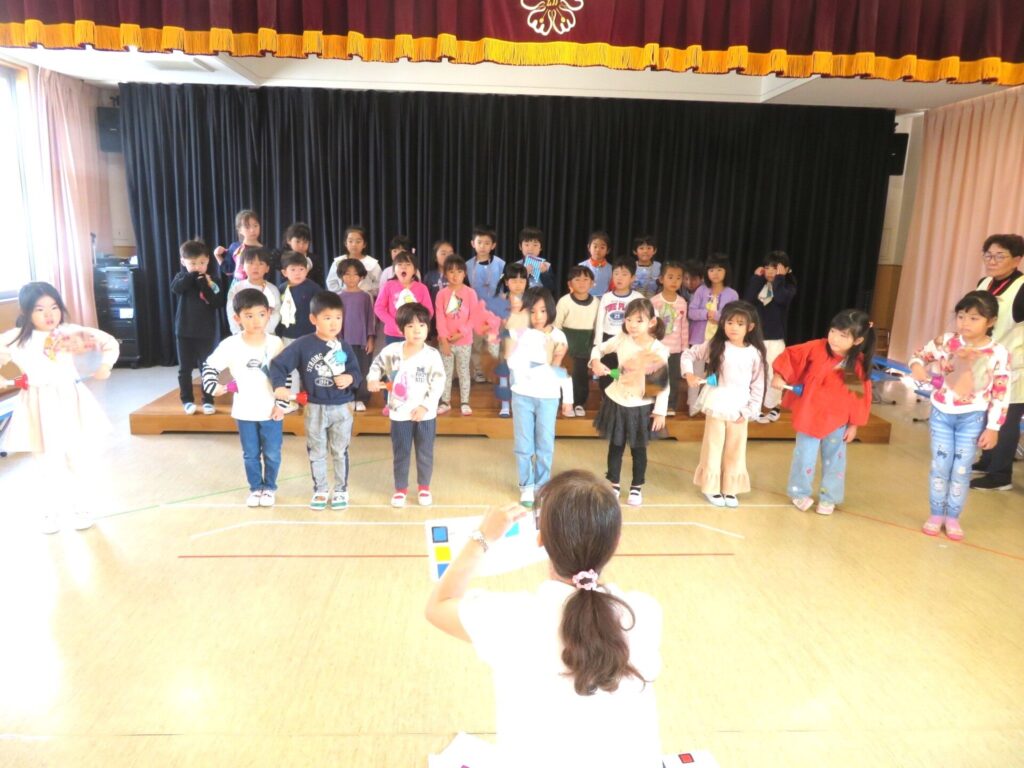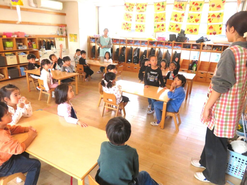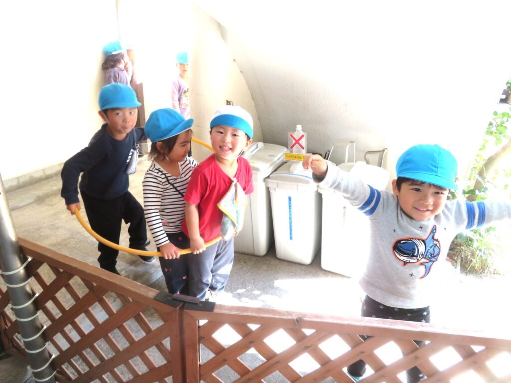 ○年少組 園庭で遊んだ。○年中組 野毛山動物園見学の振り返りをやった。キリンが餌の葉を食べていたのを見て、「ベロを使って食べていた。」「チンパンジーが2匹で追いかけっこしているのを見て「けんかしていたのかな。いや一緒に遊んでいたんだ。」と振り返っていた。○年長組 劇遊び発表会の練習やった。