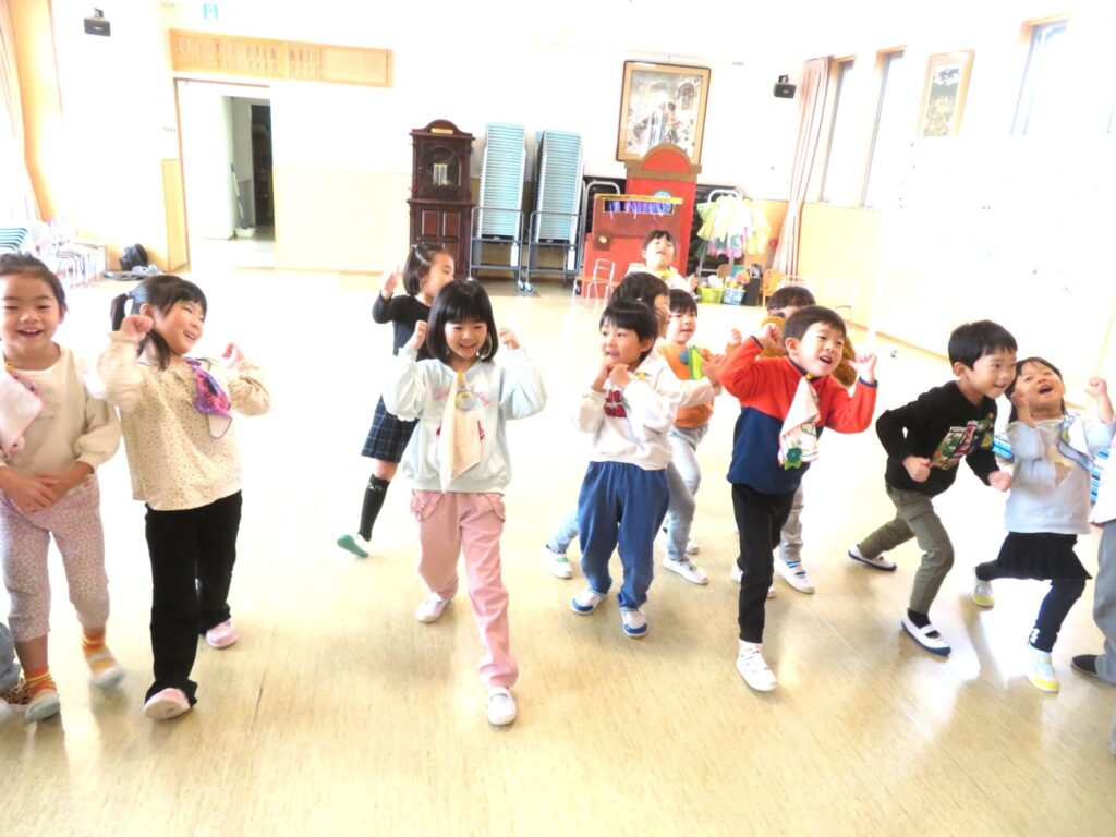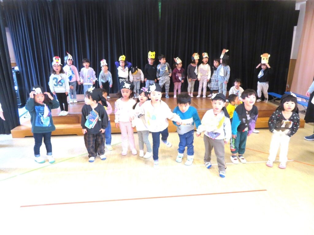 ○年少・年長組 今日は劇遊び発表会の練習をしました。年長さんが見本を見せてくれたので、年少さんたちは目を輝かせながら見ていました。 ○年中組 今日は園庭で大なわとびや砂遊びをしました。みんなで数を数えながらなわを跳んだり、砂場で思い思いの遊びを楽しんだりしていました。友だちと力を合わせる姿や、笑顔がたくさん見られました。