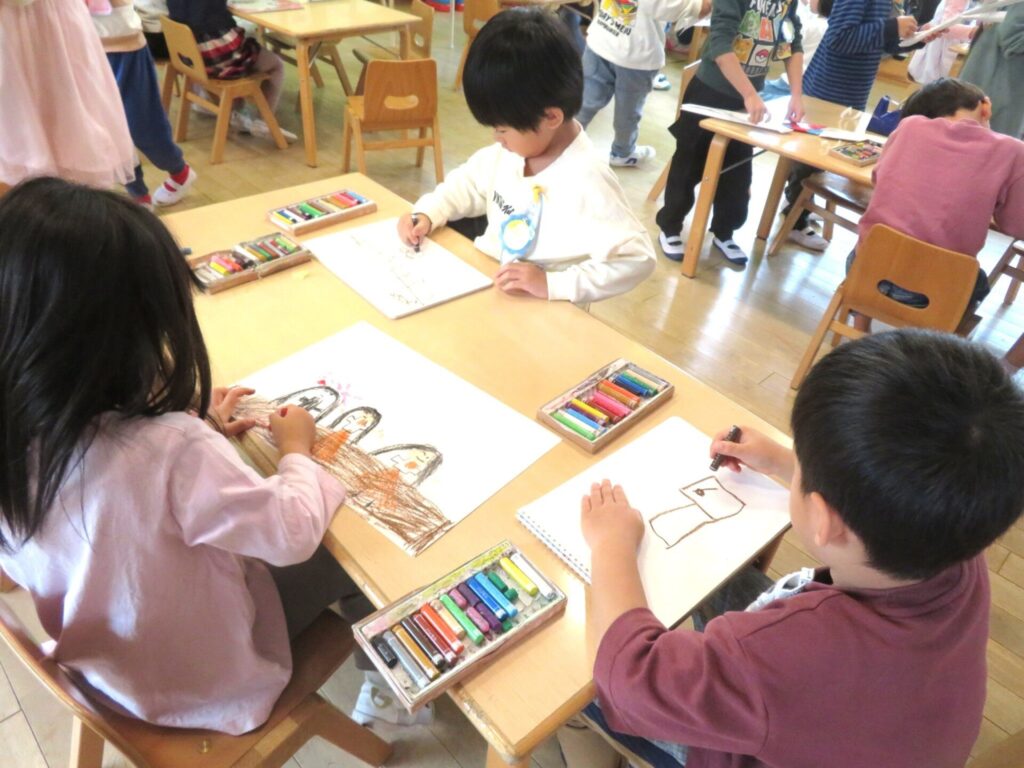 ○年長組 劇遊び発表会を思い出しながら、印象に残った場面を絵に描きました。