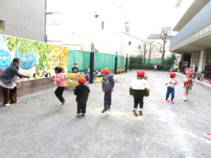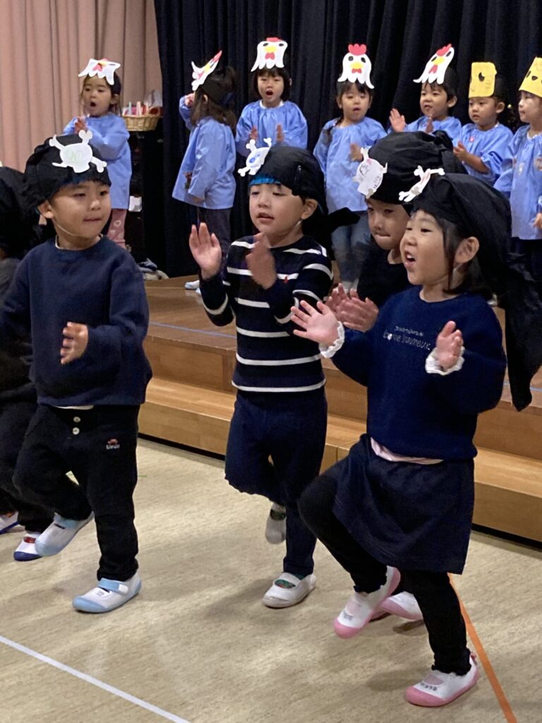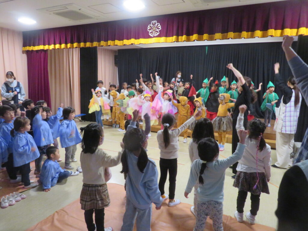 ○今日は、劇遊び発表会の見せ合い会を行いました。年少さんと年長さんが舞台に立ち、元気いっぱいに発表してくれました。年中さんはインフルエンザによるお休みが多いため、後日改めて発表します。3回目の発表とあって、子どもたちは自信をもって堂々と演じ、観ていたお友達からも大きな拍手が送られました。