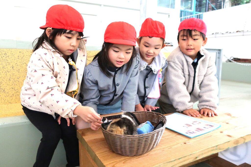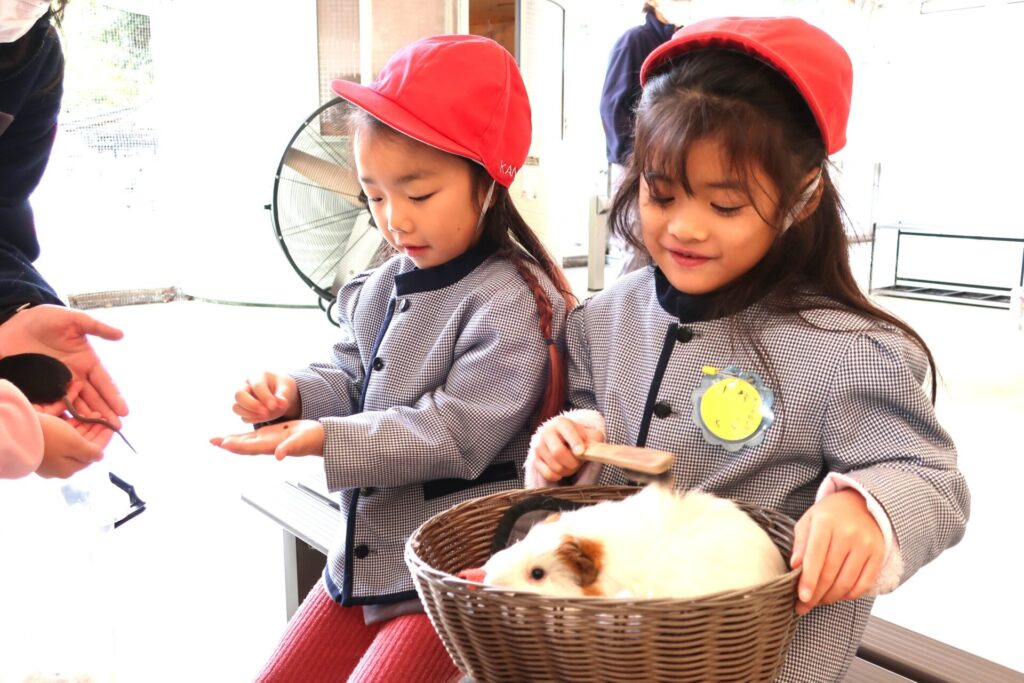○年長組 野毛山動物探検隊の今回のテーマは「ふれる」。モルモットやハツカネズミなどの動物とふれあい体験を行った。最初は少し緊張していた子も、優しくなでるうちに笑顔になり、「あったかいね」「ふわふわしてる!」と口々に話していた。動物とのふれあいを通して、「いのち」のぬくもりを感じる時間となった。