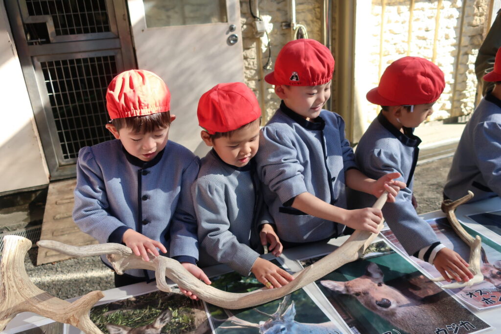 ○年長組 金沢動物探検隊 今回のテーマは「つの・きば」。動物の角や牙について職員の方から説明していただき、子どもたちは目を輝かせながら話を聞いていました。