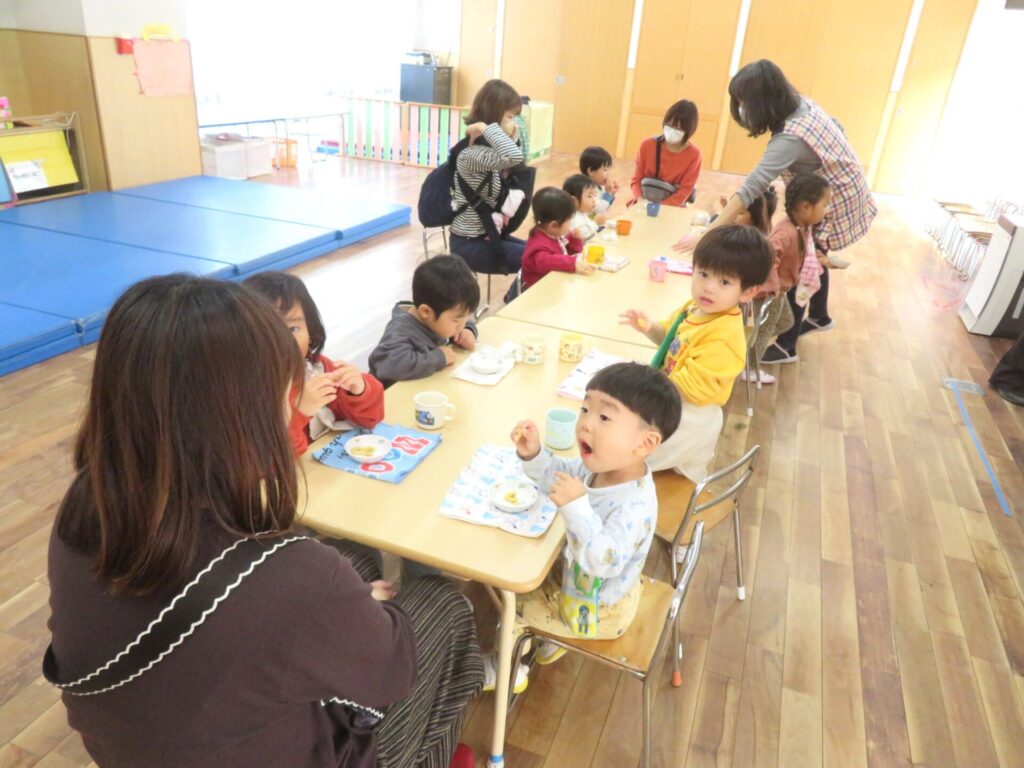 ○2歳児プレ幼稚園どんぐり組みんなで“バナナチップのお菓子”と“のりせんべい”を食べた。子どもたちは「おいしい!」と、喜んで食べていた。