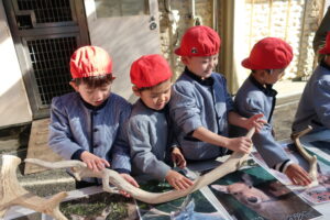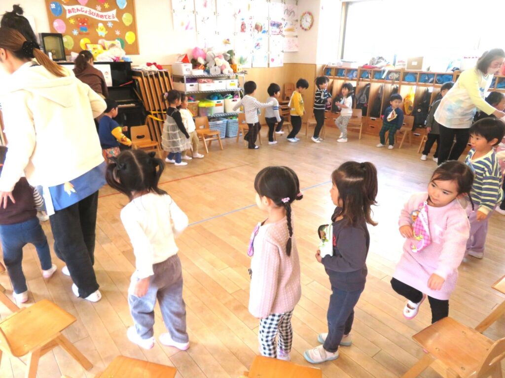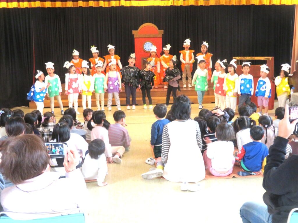 ○年中組 インフルエンザで延期していた劇遊び発表会の見せ合い会を実施しました。演目「しちひきのこやぎ」を元気いっぱいに披露し、観ていた友だちからたくさんの拍手をもらいました。