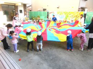 ○年長組 園庭で友だちと「はないちもんめ」を、声を掛け合いながら楽しんでやっていました。