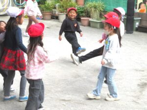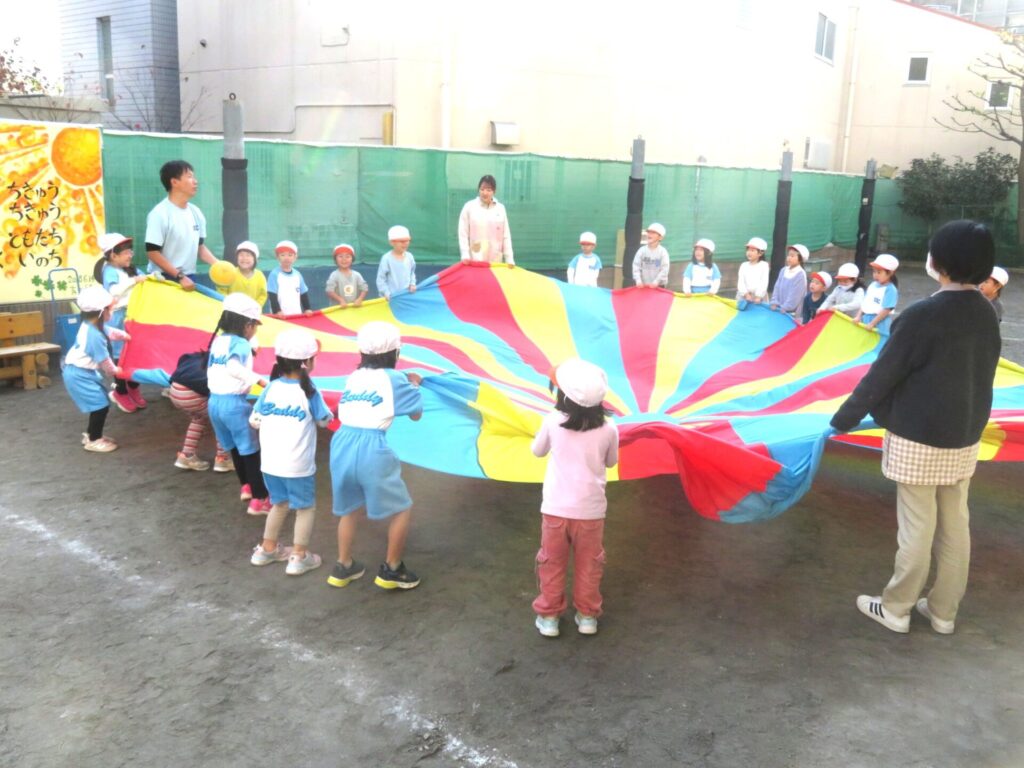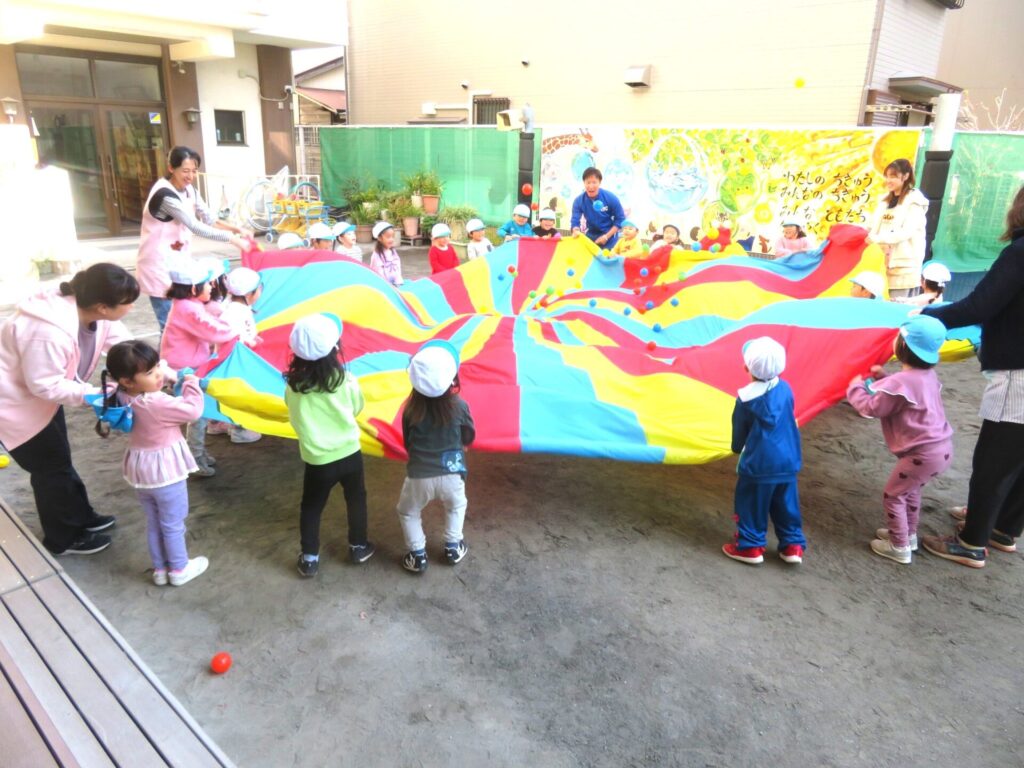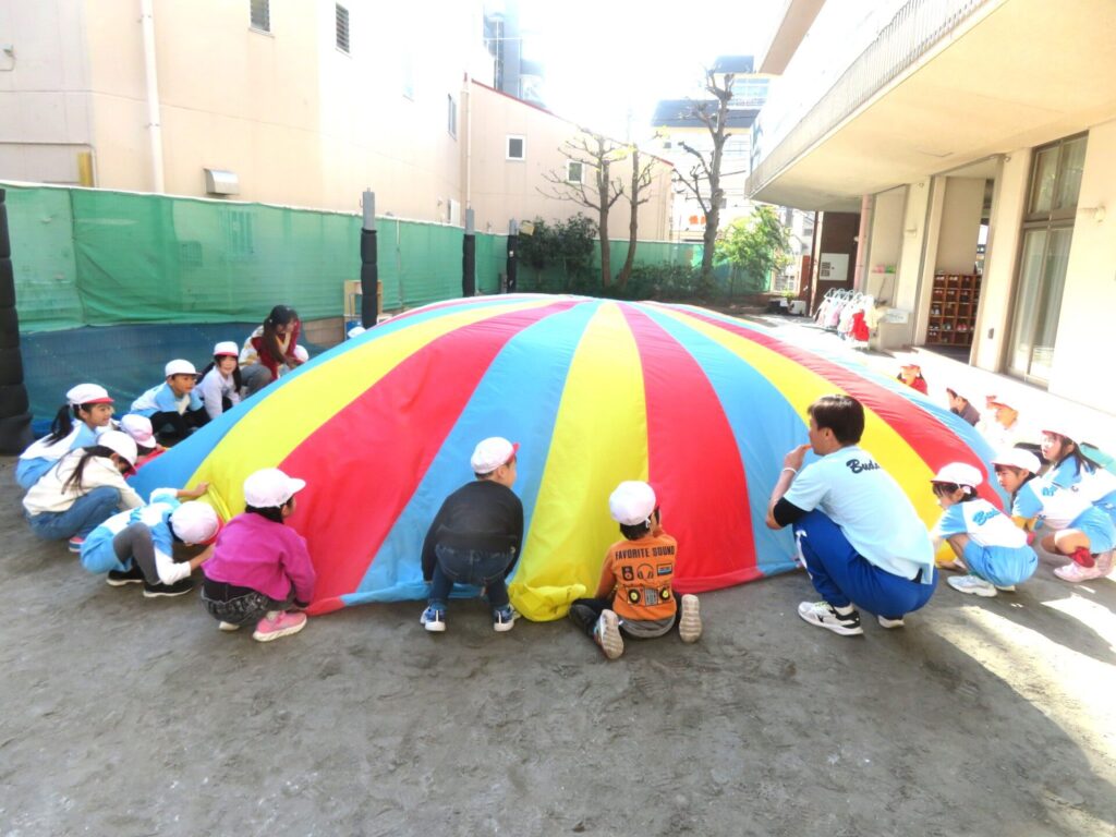 ○体育教室パラバルーン遊びを行いました。まずはみんなで力を合わせてバルーンをふくらませ、「プリン」を作りました。その後、中央にボールを置き、ポップコーンやたこ焼きに見立てて揺らしたり跳ねさせたりすると、子どもたちは大歓声!色とりどりのバルーンがふくらむたびに目を輝かせ、夢中になって楽しむ姿が見られました。