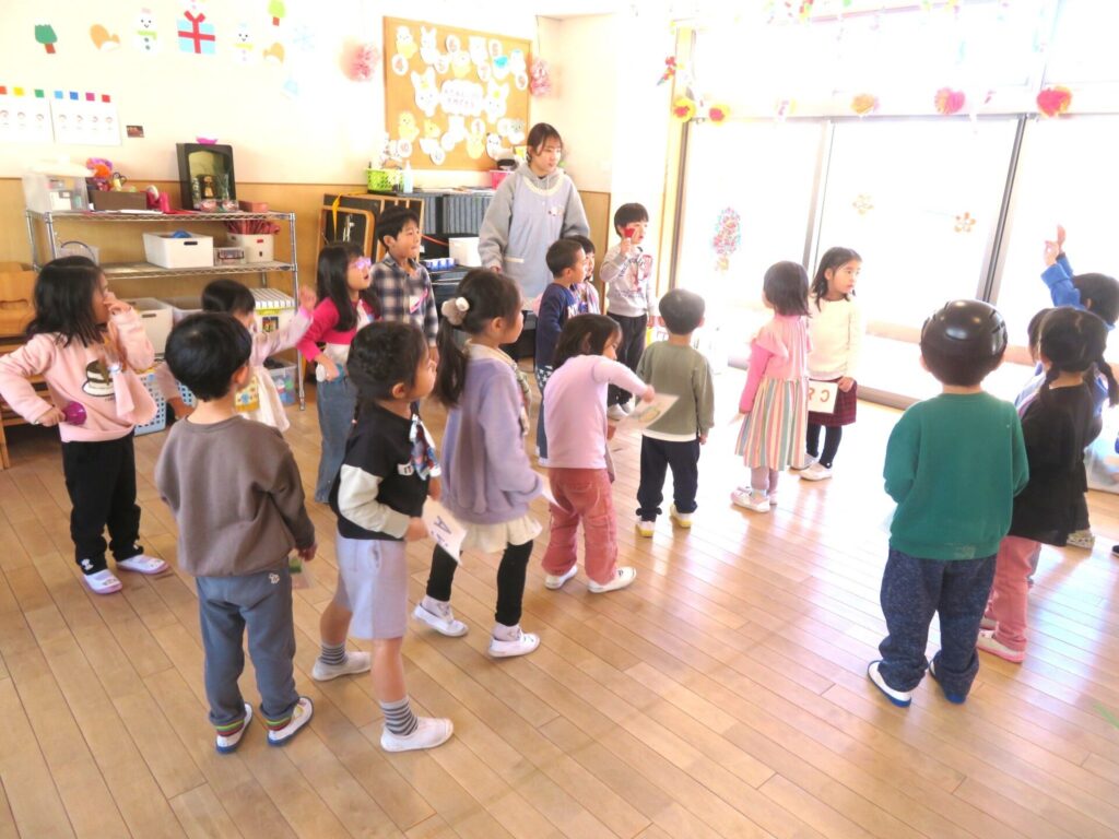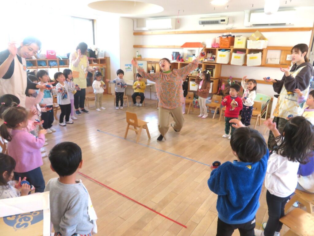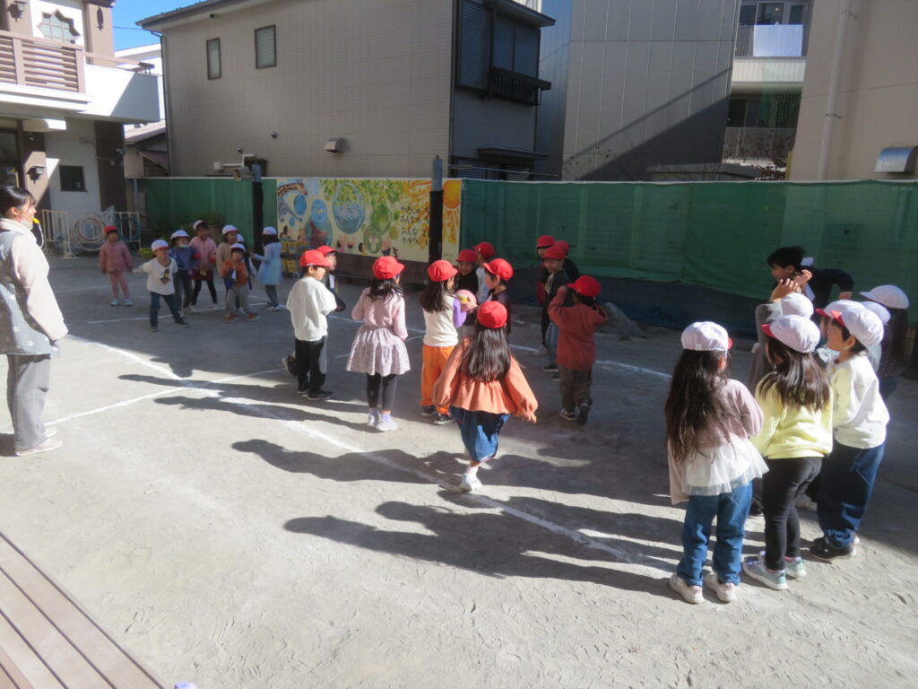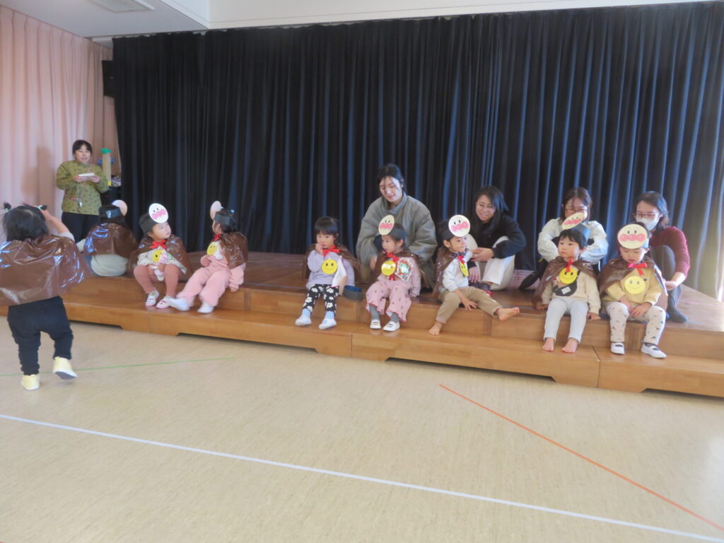 12/4(木)晴れ○2歳児プレ幼稚園・どんぐり組どんぐり発表会で披露する「アンパンマン」の練習をしました。