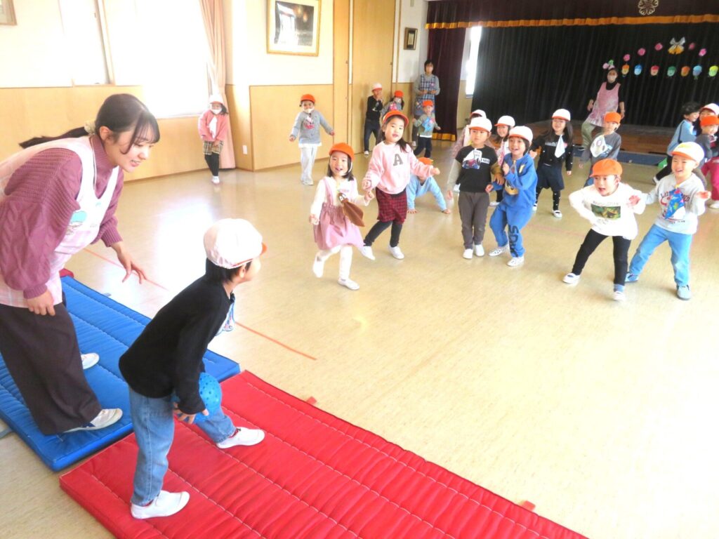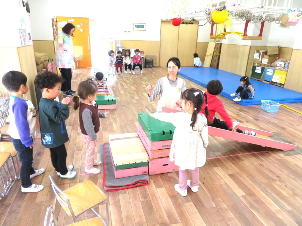 ○年少組サーキット遊びを行いました。滑り台・はしご歩き・球を落とさないようになわ歩きなど、変化のある種目を工夫して取り組み、楽しんでいました。
