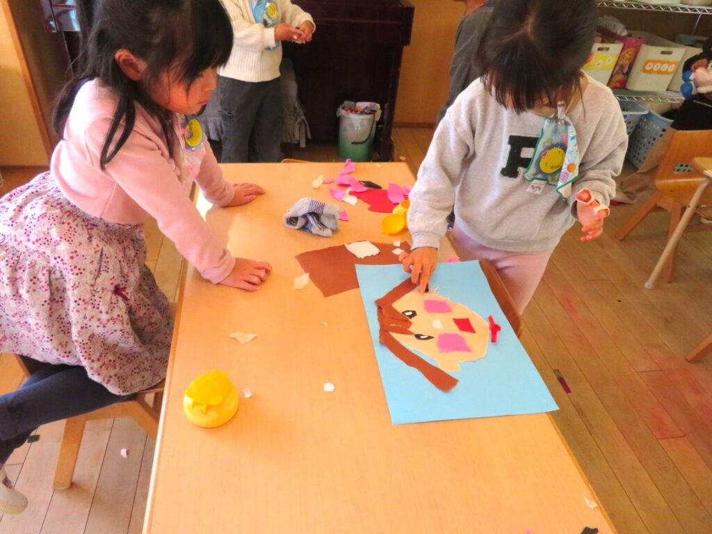 ちぎり絵で自分の顔を作りました。紙の選び方やちぎり方を工夫し、子どもたち一人ひとりの個性が表れた作品ができあがっていました。