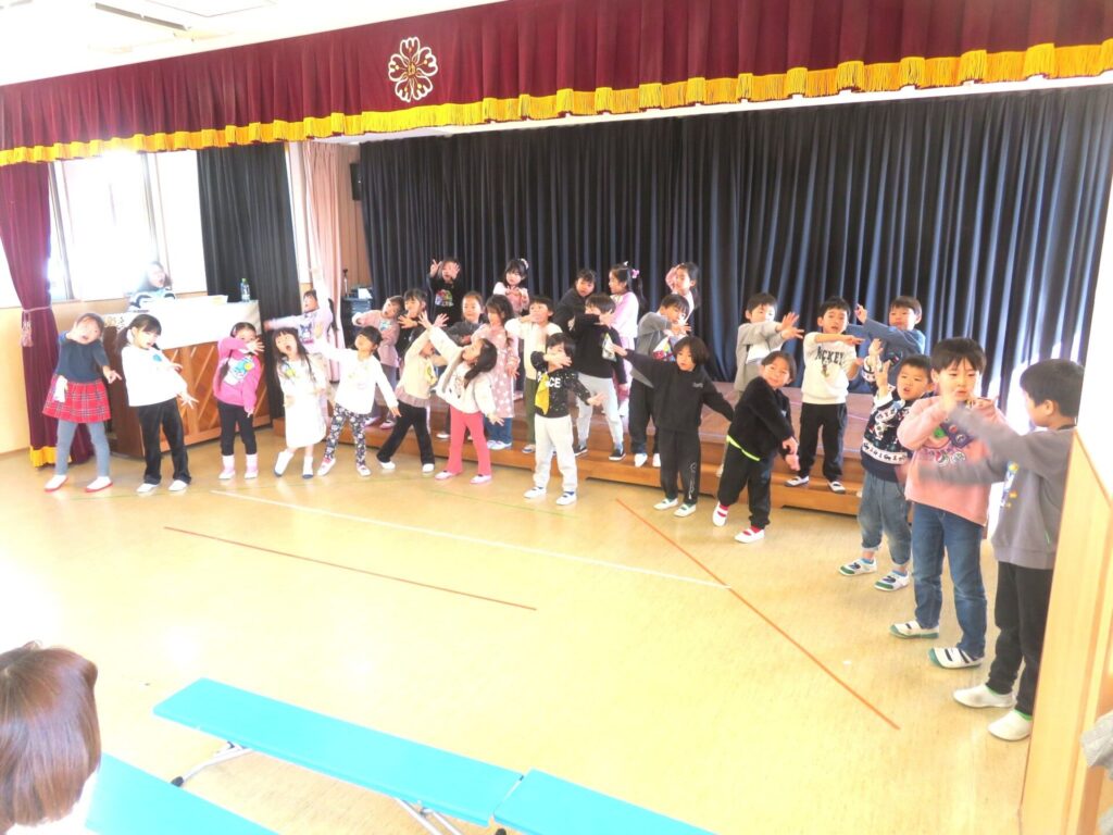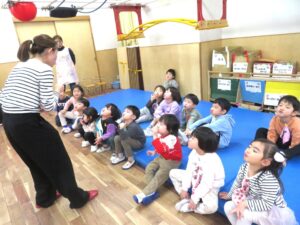 ○音楽教室(Voiceの時間) 終業式で発表する歌の練習を行いました。 各学年の発表曲は、 年少組「おおきなたいこ」 年中組「むらまつり」 年長組「にじのむこうに」 です。 当日は保護者参観もありますので、どうぞ楽しみにしていてください。