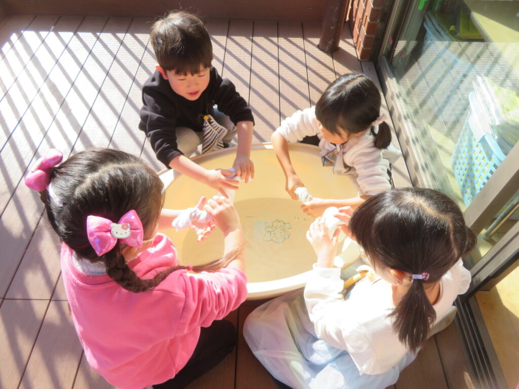 ○年長組 ぞうきんをしっかり絞って大掃除をやりました。