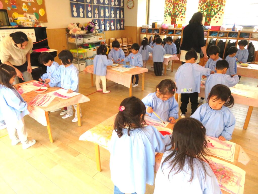○年少組はじき絵をしました。クレヨンで自由に模様を描いたあと、絵の具を塗ると色がはじく様子を楽しんでいました。