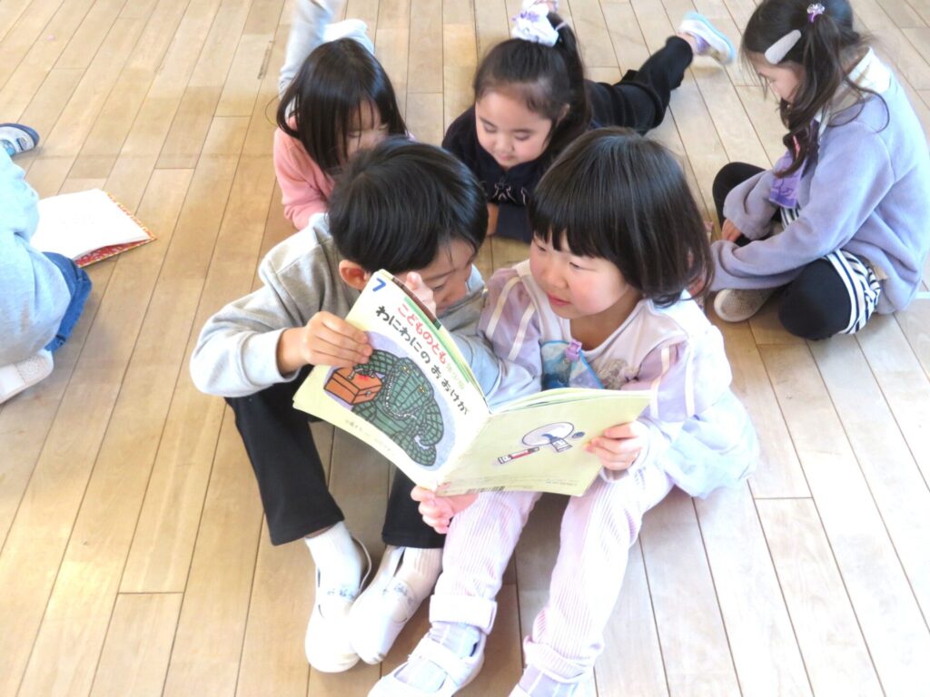 ○年中組りか先生の「絵本やさん」で絵本を読んでもらい、その後はそれぞれ好きな本を選んで、友だちと一緒に楽しく読んでいました。