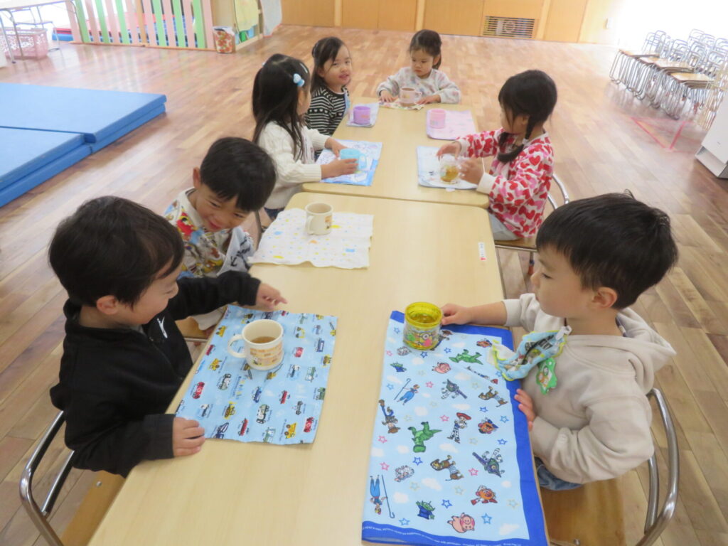 ○2歳児プレ幼稚園どんぐり組おやつの準備をしながら、お友だちと楽しいお話をして、にぎやかなひとときを過ごしました。