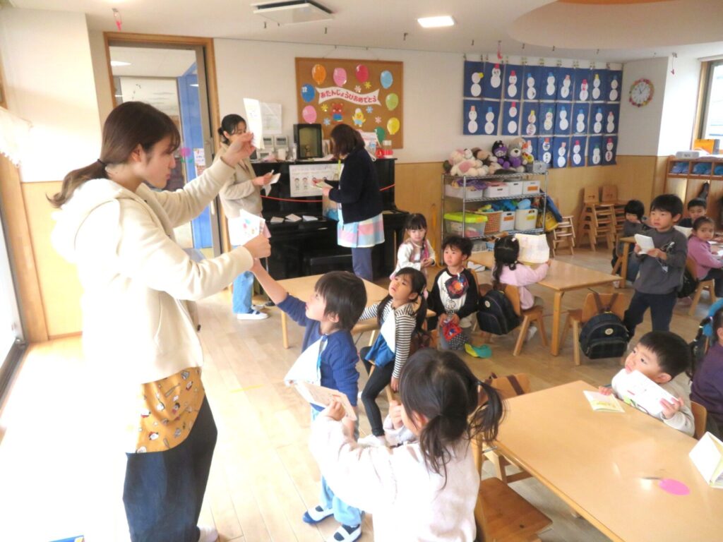 ○年少組園だよりのプリントの折り方を、先生に教わりながら一つひとつ丁寧に取り組みました。