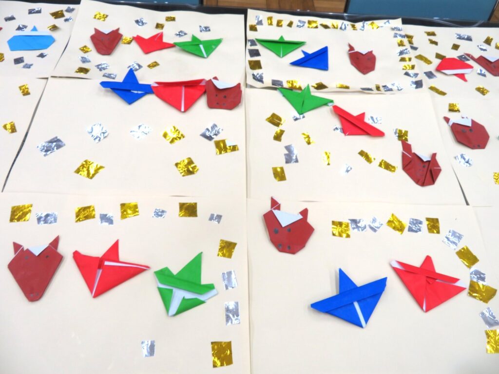 1/21(水)くもり 2026年1月21日 最終更新日時 : 2026年1月21日 manager ○年少組 絵の作品づくりで「はじき絵」を楽しみました。 ○年中組 おりがみで「うま」と「こま」を作りました。 ○年長組 「すーぴた」を合言葉に、くつを下駄箱へ。 「すーっと入れて、ピタッ」と端にそろえて入れることを始めました。