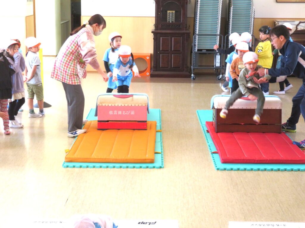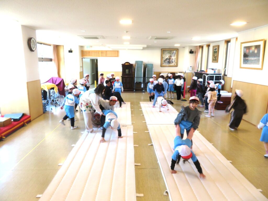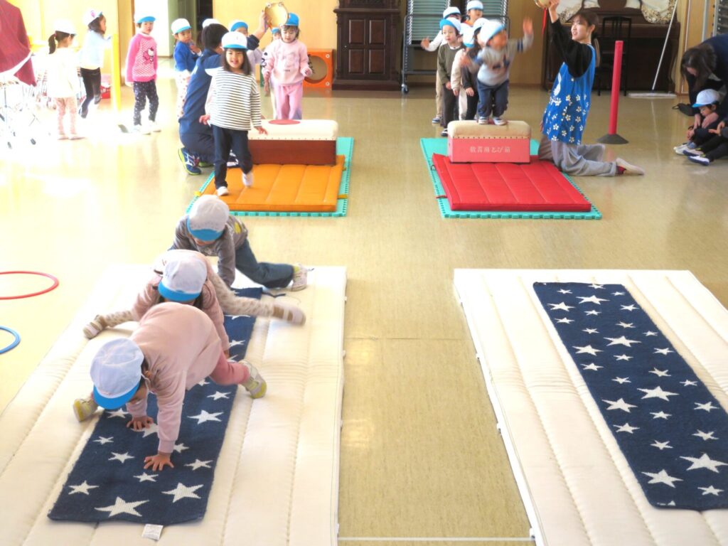 ○体育教室 マット運動に挑戦し、笑顔で体を動かす姿が見られました。
