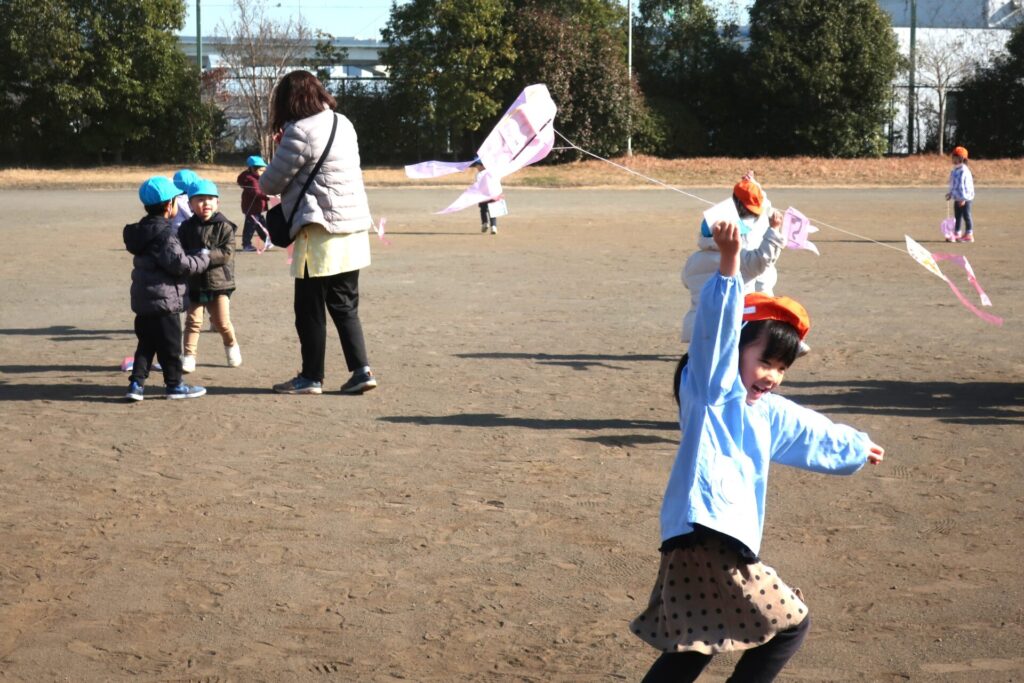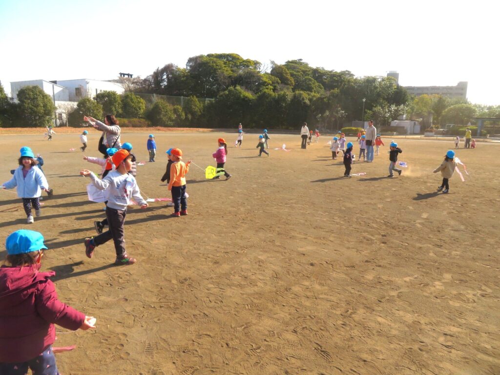 ○年少組・年中組 たこあげ大会 小港南グランドでたこあげ大会を行いました。青空の下、子どもたちの凧が元気よく空に舞い上がりました。