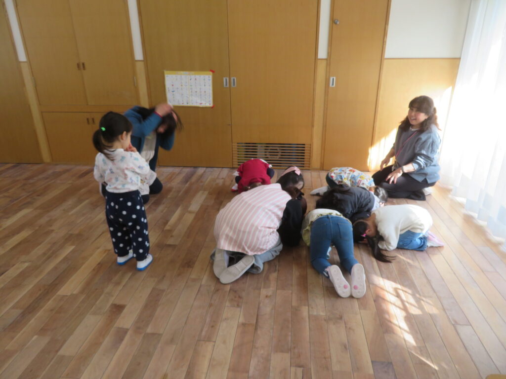 ○2歳児プレ幼稚園どんぐり組 避難訓練の練習を行いました。先生の話を聞きながら、みんな上手に集まり「ダンゴムシ」のポーズができていました。