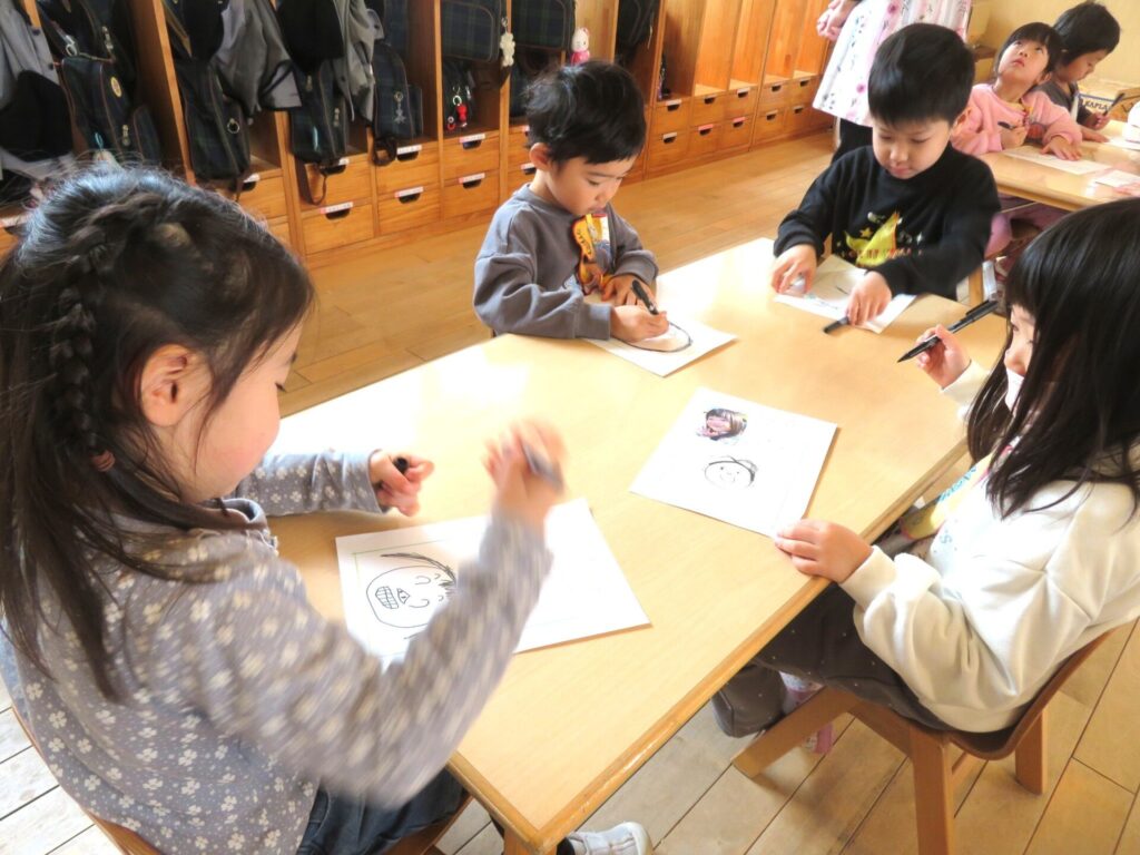 ○年中組 「やわらぎ」に載せるための自画像を描き、自分の顔をじっくり見つめながら表現した。