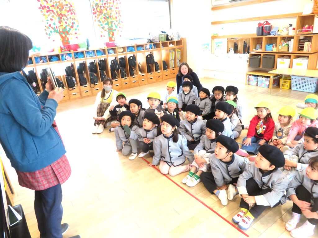 ○年少組 リカ先生の絵本屋さんで『わにわにのごちそう』を読んでもらい、物語の世界を楽しんだ。