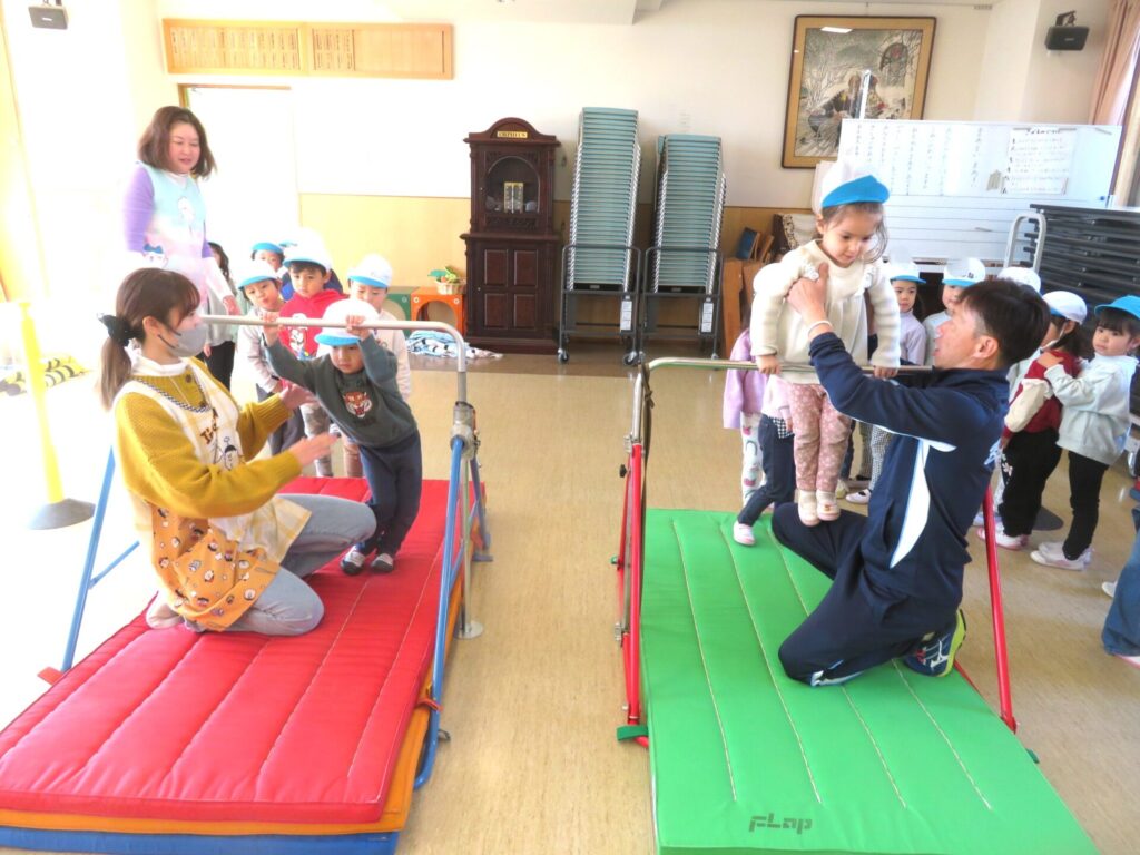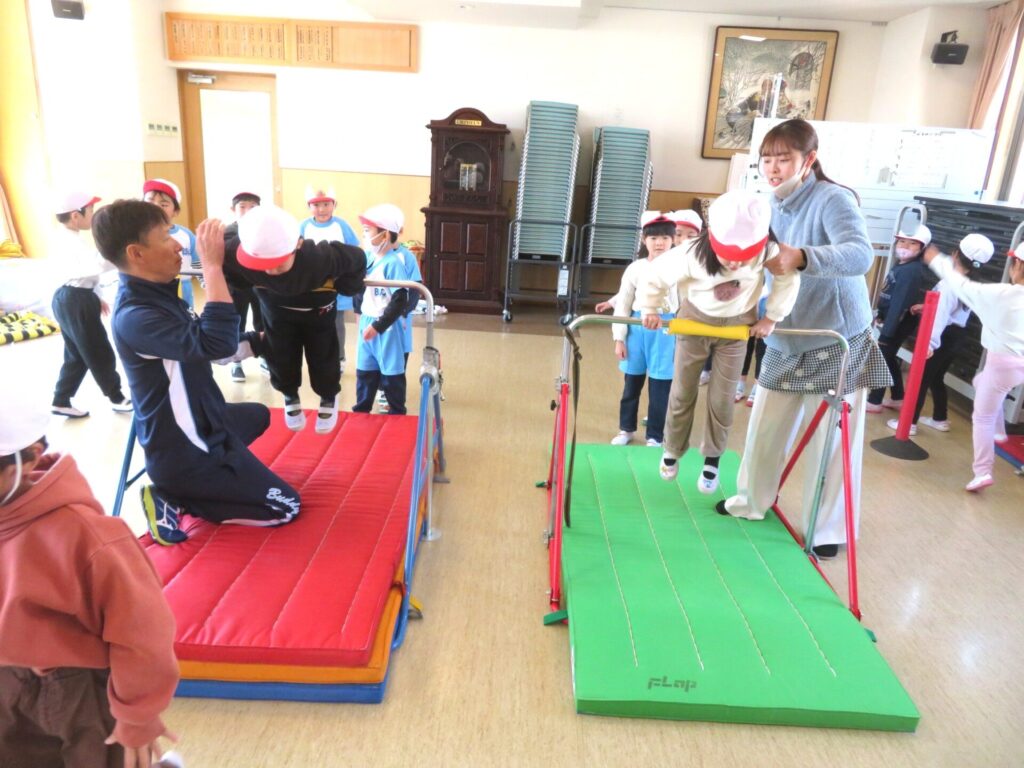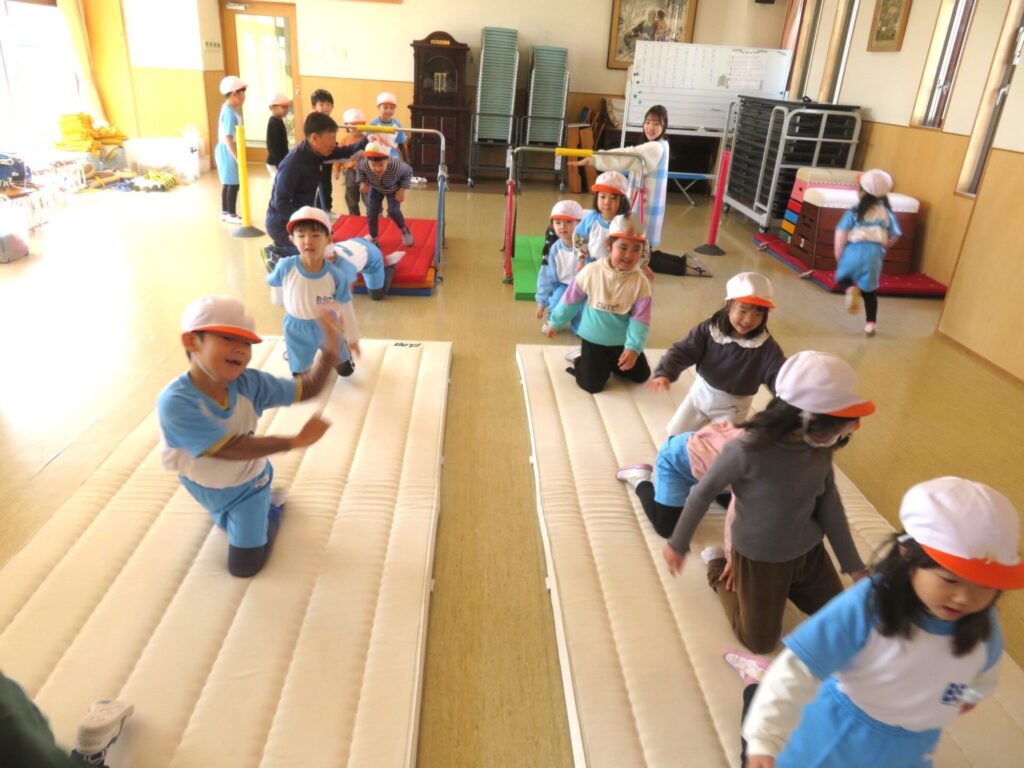 1/30(金)晴れ 2026年1月30日 最終更新日時 : 2026年1月30日 manager ○体育教室 鉄棒やマット運動に取り組みました。くるっと回ったり、体を伸ばしたりしながら、一人ひとりができる動きを楽しみ、元気いっぱい体を動かしていました。
