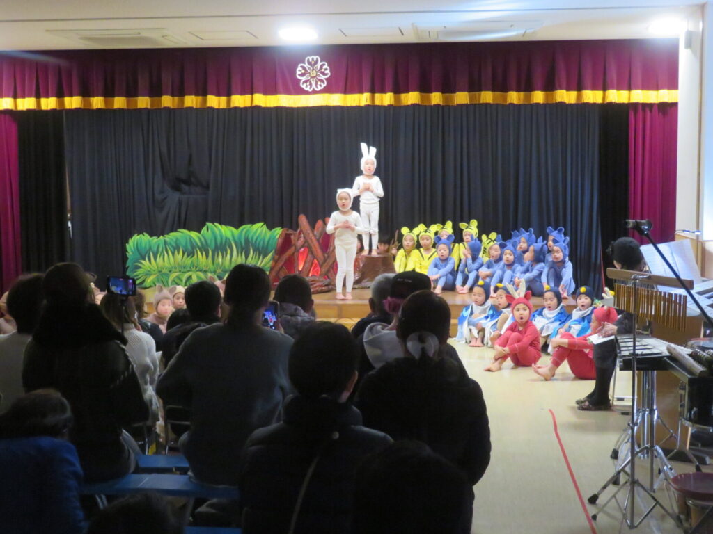 ○年長組 卒園公演「月のうさぎ」最終公演。子どもたちは伸び伸びと演技し、やり切った満足そうな表情を見せていた。小学校の1年生担任の先生、年長組の保護者、来年度入園予定の方々も観賞し、大きな拍手が送られた。