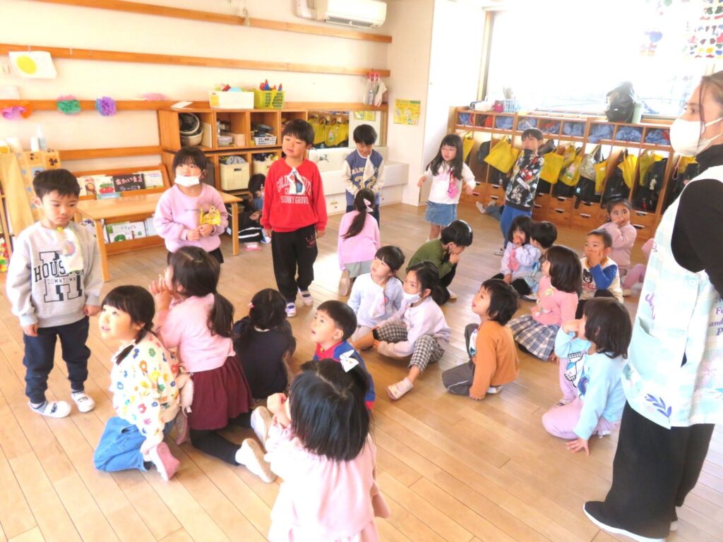 ○年中組 友だちと伝言ゲームを行い、言葉をつなぐ面白さを味わった。