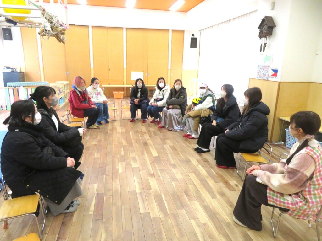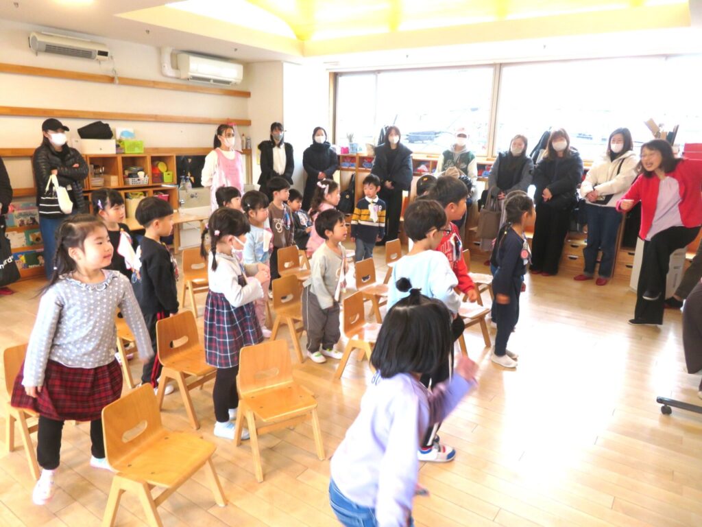 ○年中組 最後の保育参観・懇談会を行った。参観ではVoiceを行い「さんぽ」を歌った。入園当初は甘えん坊で親と離れることが難しかった子どもたちが、今ではしっかり園生活を送れるようになった姿に、保護者の方々も成長を喜んでいた。