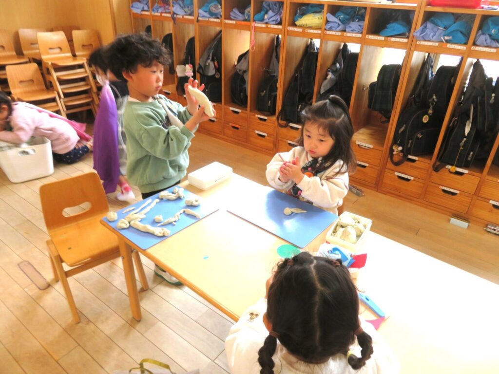 ○年少組 粘土遊びを楽しんだ。思い思いに形を作りながら、手の感触や表現する楽しさを味わっていた。