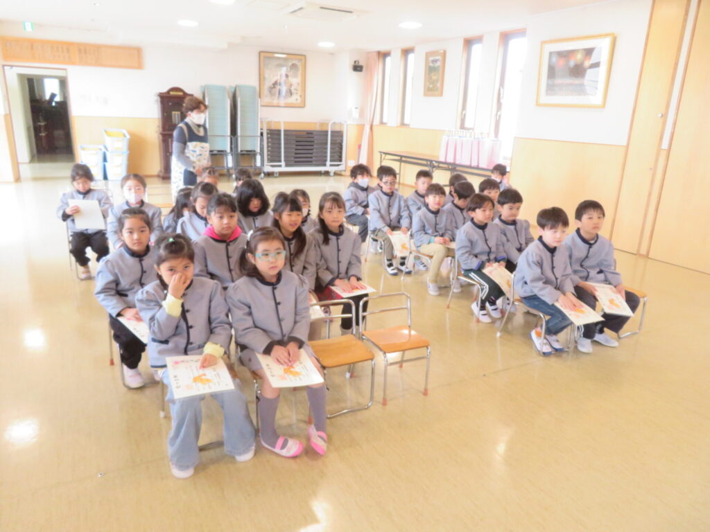 ○年長組 卒園式の練習を行った。卒園まであと3日。子どもたちの中にも少しずつ緊張や期待が高まり、どこかドキドキした様子が感じられるようになってきた。