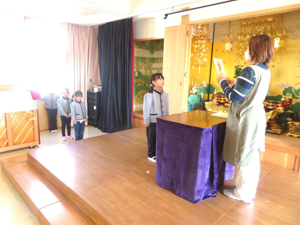 ○年長組 卒園式に向けて証書のもらい方の練習を行いました。一人ひとりの姿がだんだんと凛としてきており、卒園の日が近づいていることを感じる時間となりました。