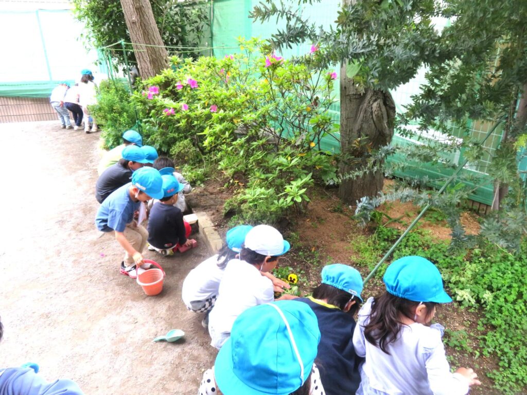 ○年長組 ダンゴムシを見つけると、子どもたちは大はしゃぎで夢中になって捕まえていました。